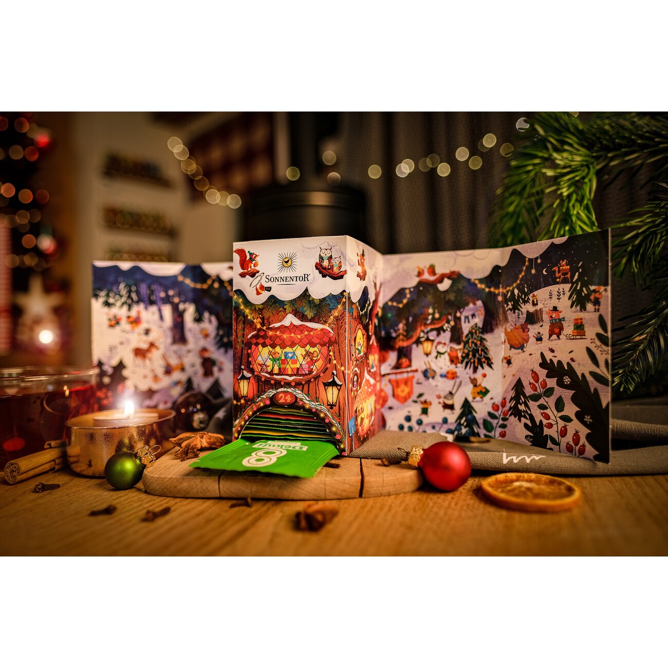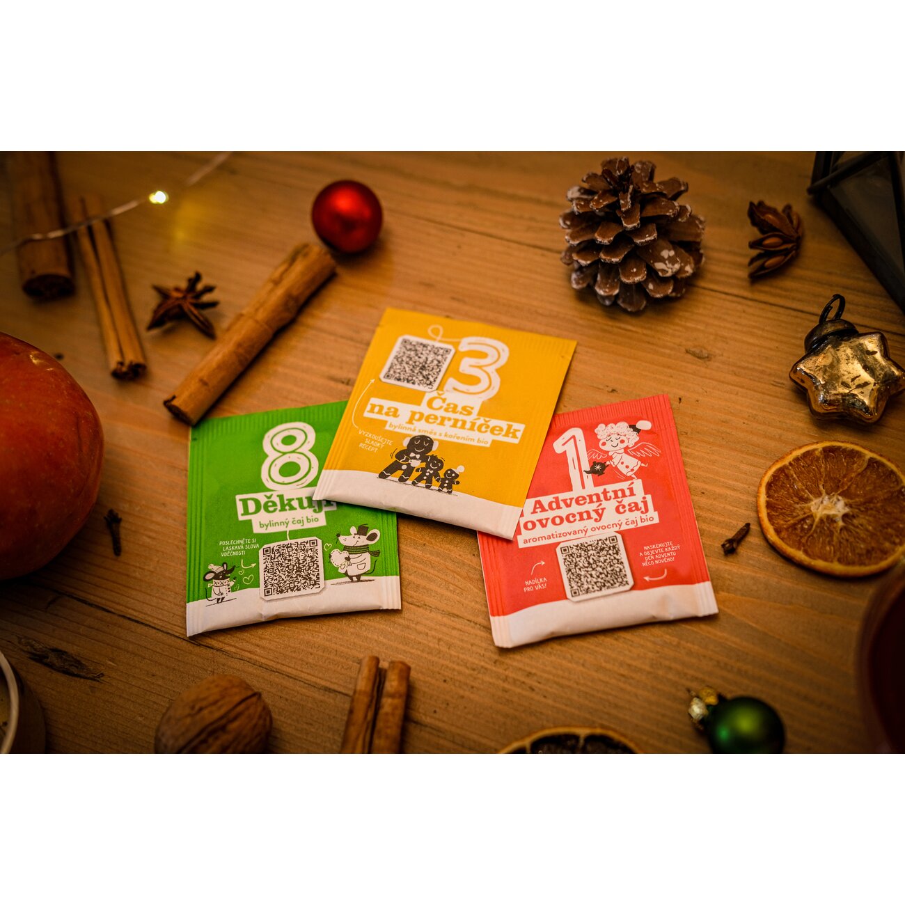 Adventní ovocný čaj - aromatizovaný ovocný čaj: jablka bio, ibišek bio, šípek bio, skořice bio, hrušky bio, kdoule bio, pomerančová kůra bio, hřebíček bio, vanilka extrakt bio;