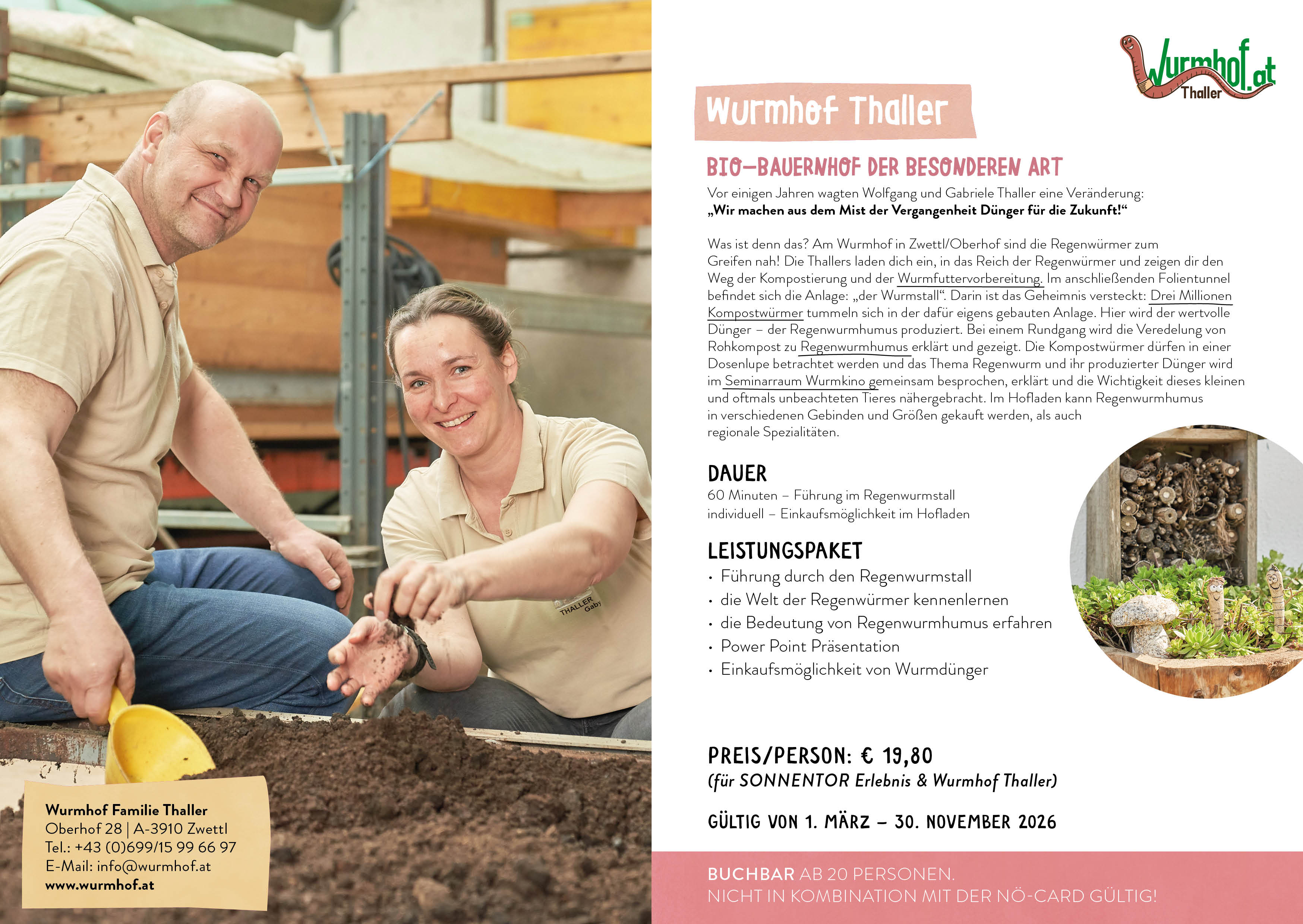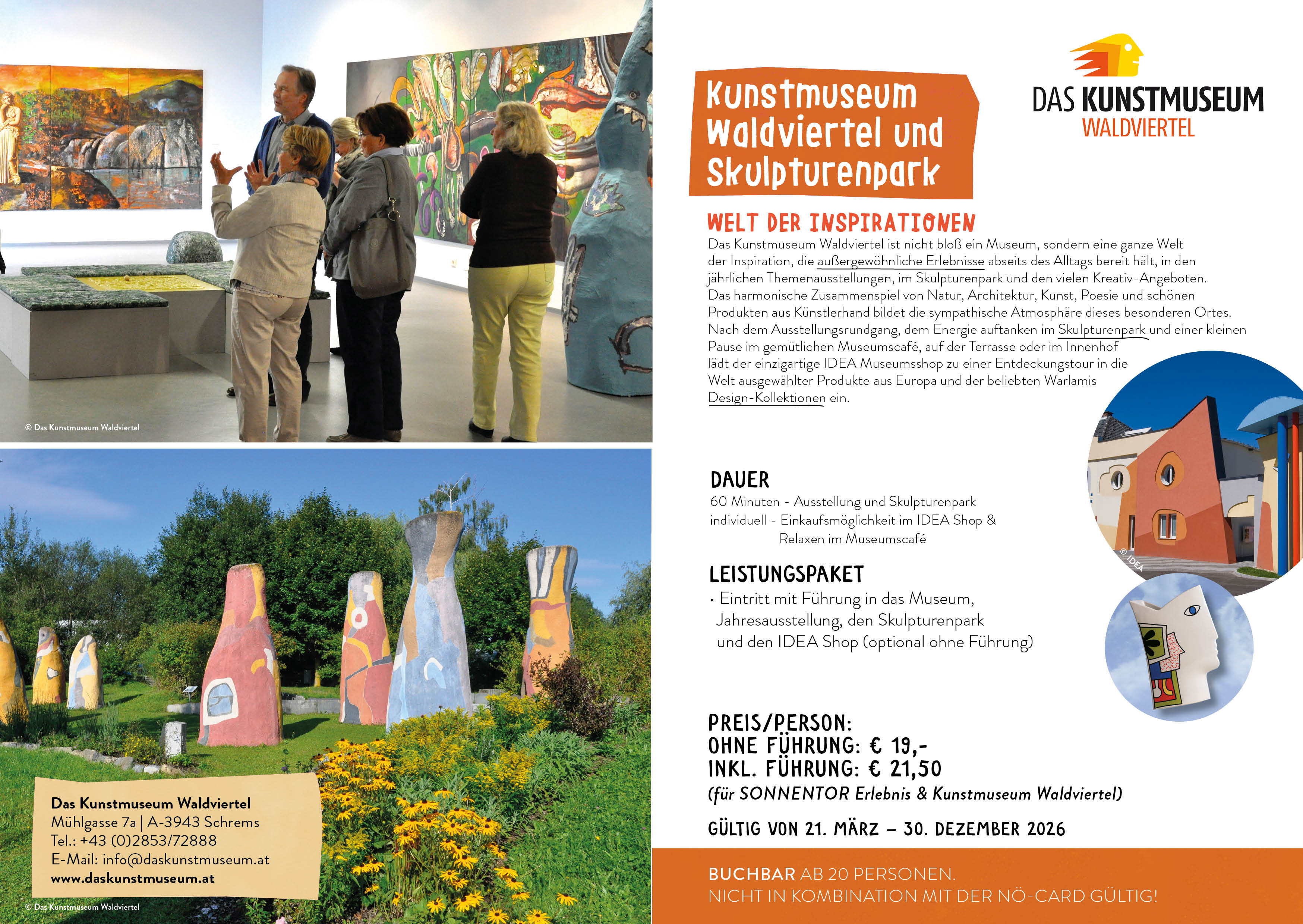 Erlebe das Waldviertel bei deiner Gruppenreise auf vielfältige Weise. Verbinde deinen Besuch bei SONNENTOR mit den besten Ausflugszielen der Region und sichere dir exklusive Vorteile. Stelle dir dein Programm ganz einfach im Baukastensystem zusammen – wähle eine Führung bei SONNENTOR und kombiniere sie mit einem Angebot unserer Gruppen-Package-Partner.