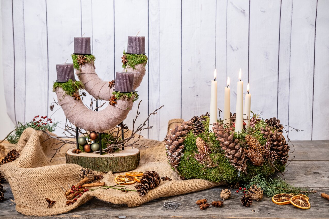 Auch die Kerzen sind bereits im Preis enthalten. Du kannst aus unterschiedlichen Formen und Farben wählen und damit deiner Gestaltung den letzten, persönlichen Akzent geben. Ein Workshop voller gemütlicher Atmosphäre, natürlicher Materialien und kreativer Freude – perfekt, um in den Advent einzutauchen.