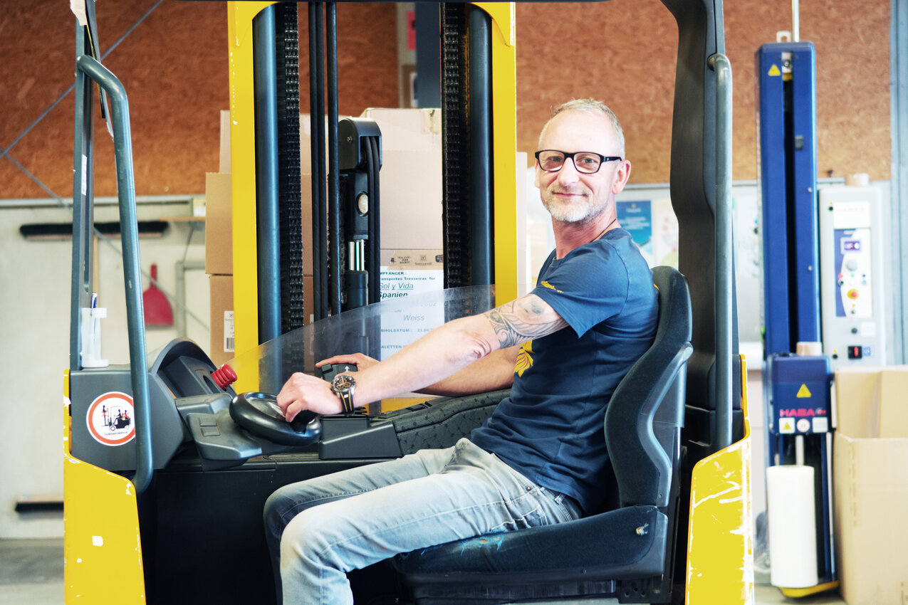 etikettierten Produkten, die in die weite Welt verschickt werden. Da sie oft eine weite Reise antreten, müssen sie gut verpackt und die Paletten transportsicher zusammengestellt werden. „Es wird nicht nur fertige Ware verschickt, sondern auch Rohwaren werden von unseren Kund:innen bestellt“, berichtet er über seinen Arbeitsalltag.