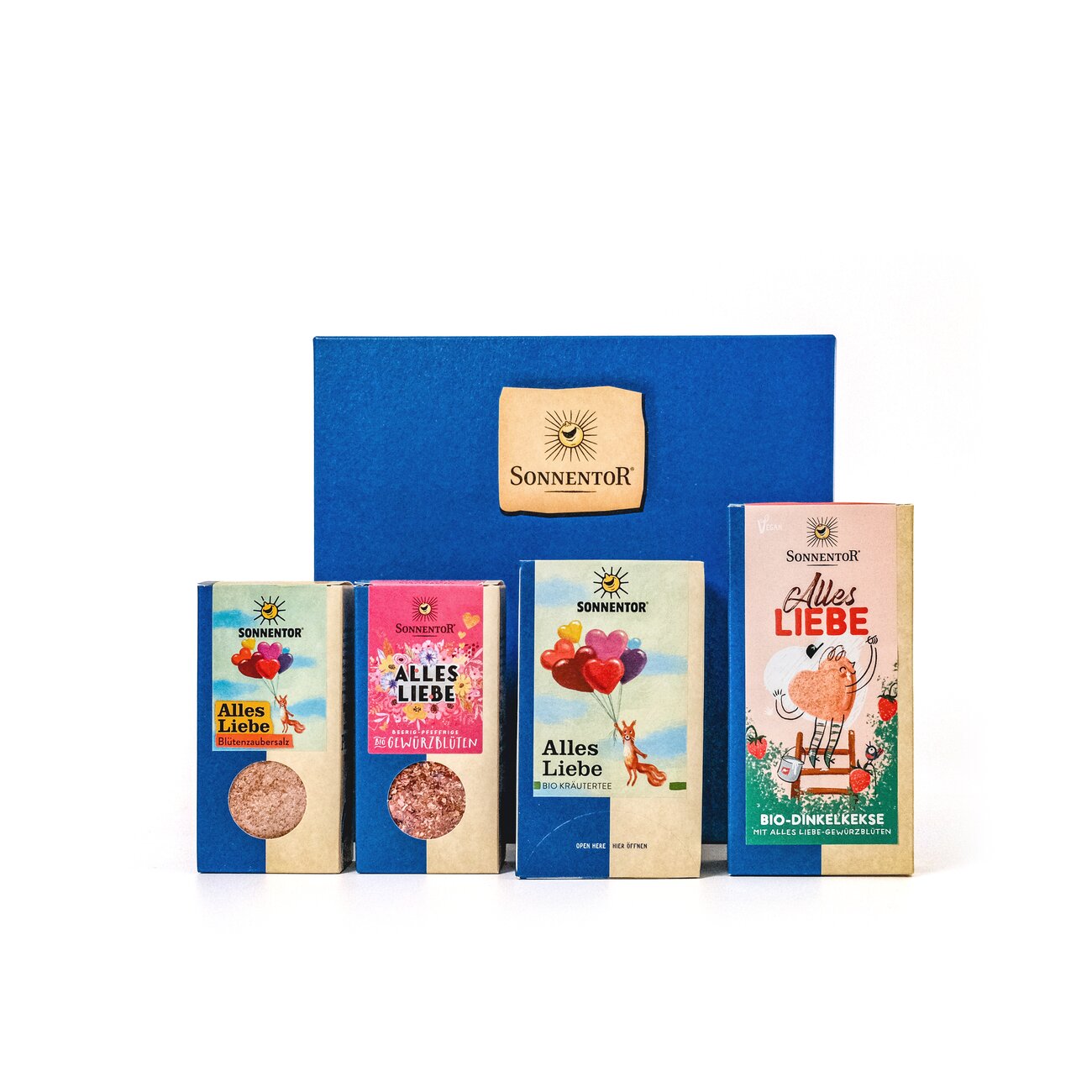 Inhalt: je 1 Stück, Alles Liebe Kräutertee bio Aufgussbeutel Spenderkarton, Alles Liebe Gewürzblüten bio Packung, Alles Liebe Kekse bio, Alles Liebe Blütenzaubersalz bio Packung. Zutaten, Allergene und Nährwerte der einzelnen Sorten findest du bei den einzelnen Produkten.