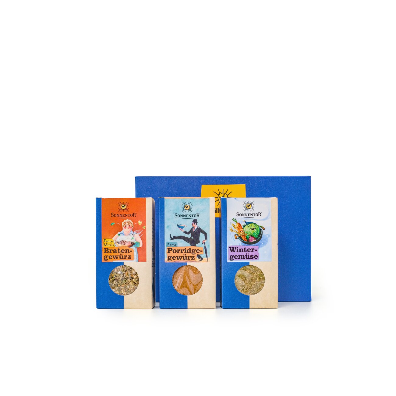 Inhalt je 1 Stück: Wintergemüse-Gewürz bio, Packung, Tante Mizzis Bratengewürz bio, Packung, Sams Porridge Gewürz bio, Packung. Zutaten, Allergene und Nährwerte der einzelnen Sorten findest du bei den einzelnen Produkten.