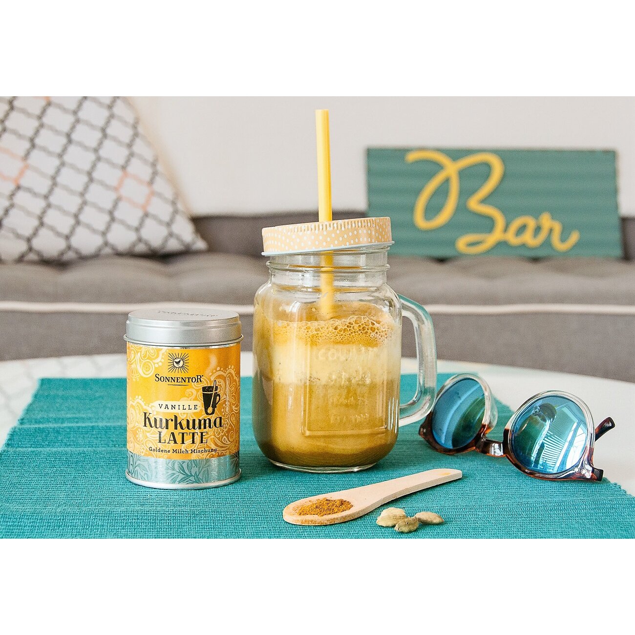 1 TL Kurkuma-Latte Mischung (ca. 2 g) in 250 ml (Pflanzen-) Milch einrühren, erwärmen und nach Belieben süßen.