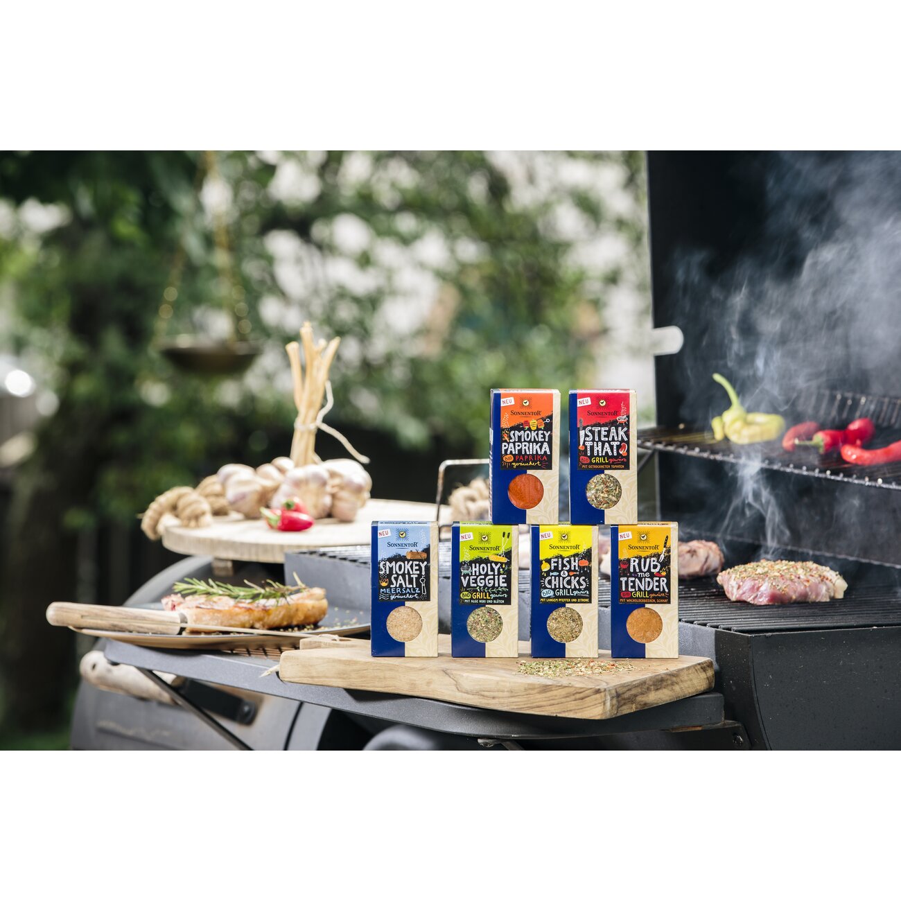 Gemüse ist dein Fleisch? Holy Veggie rückt es ins Scheinwerferlicht einer jeden Grillerei. Bärlauch und Alge sorgen für besondere Aromen, die die vermeintliche Beilage ganz schnell zum Mittelpunkt der Aufmerksamkeit machen. Mit Öl mischen und Gemüse damit bestreichen. Es kann losgehen!