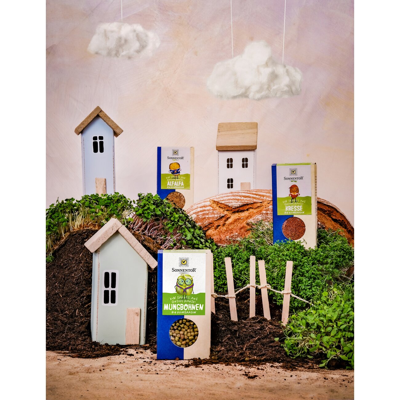Diese Böhnchen wirst du in höchsten Tönchen loben. Denn die Sprossen der Mungbohne stecken voller wertvoller Inhaltstoffe. Die beste Erziehung genießt die Mungbohne im Sprossenglas. Die Einweichzeit beträgt 12 Stunden, die Keimdauer im Keimglas etwa 4–5 Tage. Nach der Ernte schnell verspeisen – am besten auf Wokgemüse, Pfannengerichten und in Suppen.
