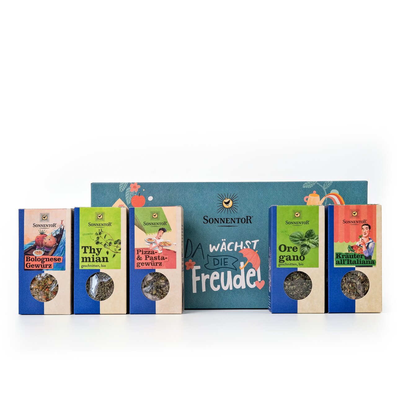 Content: Herbs All'italiana org. package, Pizza- And Pasta Seasoning org. package, Thyme cut org. package, Oregano cut org. package, Bolognese Spice org. 40 g, package. You can find the ingredients, nutrition information and allergens of each kind at the equal product.