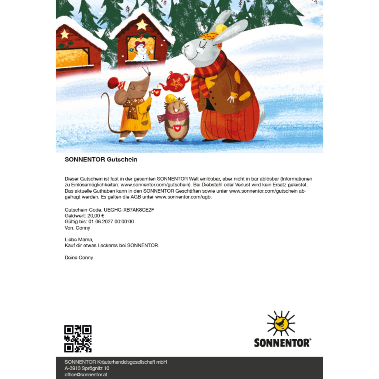 With this voucher card in Christmas design, nearly the entire SONNENTOR world opens up to the recipient. *) The amount is freely selectable (€ 5 to € 200).