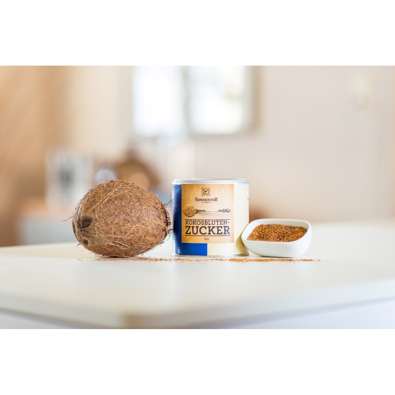 Coconut blossom sugar is obtained from the nectar of the flower buds of the coconut palm. Farmers climb coconut palms to catch the nectar in containers. This is then heated in cauldrons over fire until it granulates. Coconut blossom sugar is not only one of the most sustainable sugars, it also has a low glycemic index and unique caramel taste.